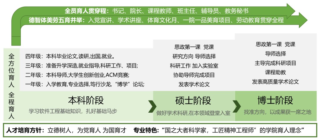 在人才培养方面,学院已形成“本-硕-博”一体化的人才培养体系,全程实施导师制。学院在开设软件工程基础课程外,还建立软件工程初、中、高三级实训课程群,开设十余门专业特色课程,课外开展博学论坛、笃行沙龙,引导学生参加创业创新大赛,提升学生实践能力,切实践行“三全育人”要求,实现德智体美劳“五育并举”,有机推动让教学相长的新时代科学育人体系。