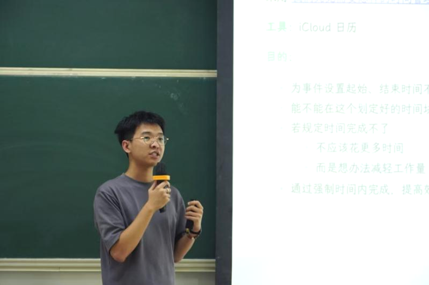 伍开钰认为学习效率的提升源于对重要事务的专注,并强调了时间管理的重要性。他建议新生从原始资料(如原版书籍、官方文档)和简单工具(如 txt 文档)入手来学习如何管理时间,并分享了自己的时间管理工作流程,涵盖需求明确、管理措施制定、以及收集、整理、执行和记录等环节。