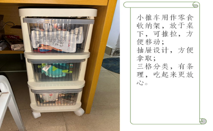 (3)“绝室无双”宿舍收纳分享活动:参与该活动的宿舍成员以视频或图文形式,对宿舍收纳技巧进行生动细致地介绍,体现了同学们对物品收纳的独特思路与实践心得。女生宿舍356D栋704和男生宿舍105栋209分享了一系列收纳好物和物品整理技巧,帮助同学们充分利用宿舍空间、管理个人物品。