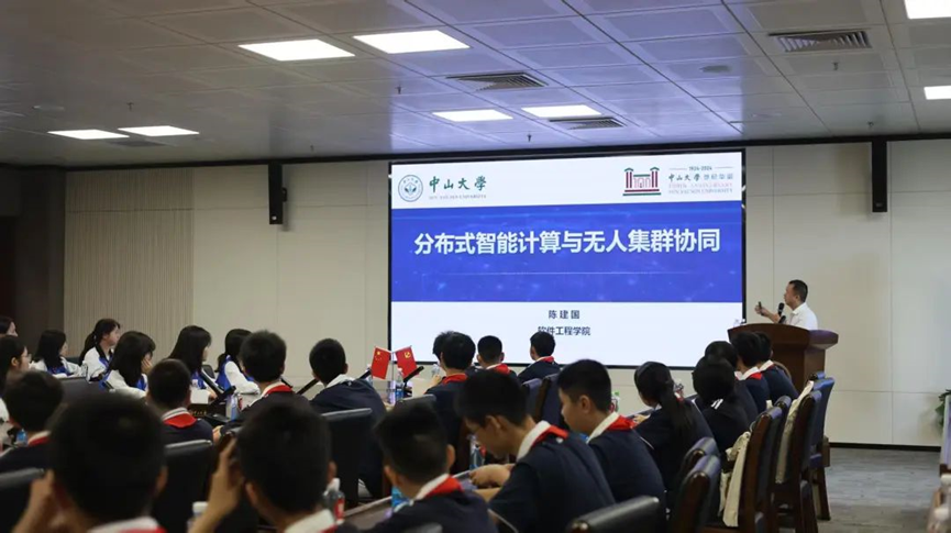 在瀚林2号A301会议室,学院陈建国副教授以《分布式智能计算与无人集群协同》为主题,为两所中学的师生们带来一场科技课程分享。他从软件代码的学习方式切入,结合动态案例演示,探讨无人机的集群协同技术应用和发展,鼓励学生们保持对科学的好奇心,努力学习,实现梦想。参加活动的中学生纷纷表示,此次课程让他们收获颇丰,不仅接触到了科技知识,也对未来进入大学后的科研学习更加充满期待。