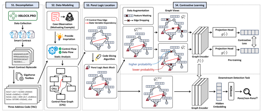 它基于智能合约的字节码,利用静态分析、代码切片、图数据增强以及对比学习等技术,在面对对抗样本和闭源合约代码等难题时仍能保持高精度判断。