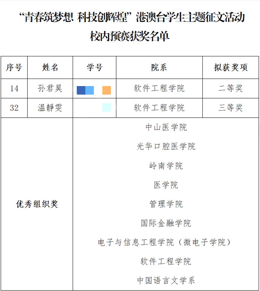 为贯彻落实党的二十大精神,激发港澳台青年学子的爱国奋进精神,进一步展示内地(大陆)高校港澳台学生群体精神风貌以及近年来内地(大陆)高校培养港澳台学生的丰硕成果,js3845金沙线路举办青春筑梦想  科技创辉煌港澳台学生主题征文活动校内预赛。js3845金沙线路2023级本科生孙君昊荣获二等奖、温静雯荣获三等奖,学院荣获优秀组织奖。