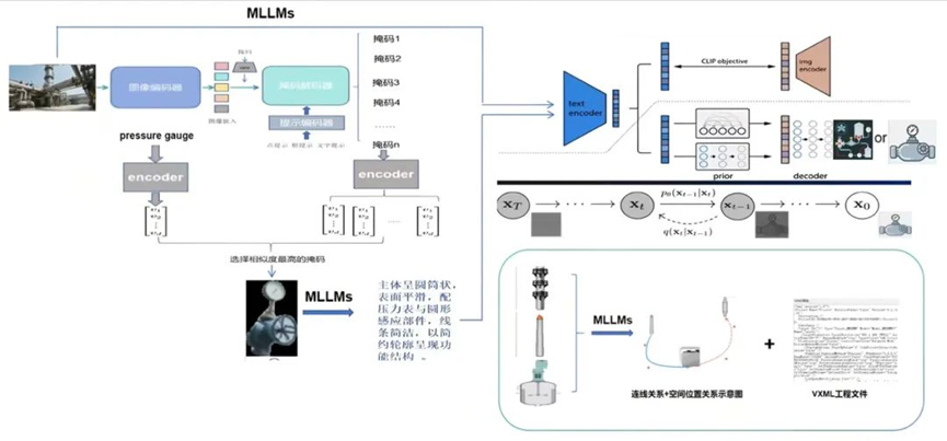 全启浩小组作品实现了工业实物图中元器件的快速分割、二维拟真图像生成、HMI工程图自动生成以及vxml工程文件的自动生成。其中,采用SAM模型进行元器件的快速分割,同时结合CLIP模型实现了基于文本提示的图像分割功能。结合多模态模型与文生图模型进行二维拟真图像生成以及HMI工程图的自动生成。利用大模型来规划元器件的空间位置以及分析元器件之间的连线关系生成示意图及其相应的VXML工程文件。同时采用聚类算法来简化图像颜色,实现元器件实物图卡通化,采用骨架化算法实现连线关系的提取。