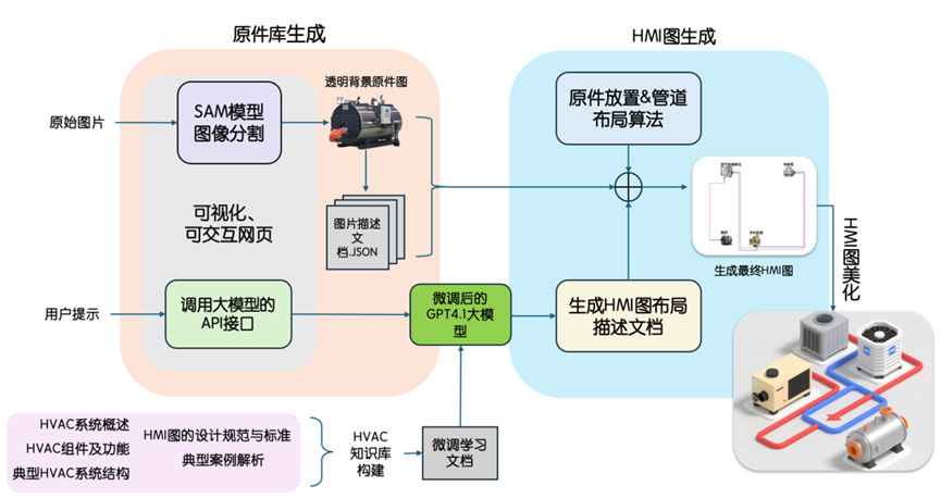 王希雯小组作品大致思路是将HMI图抽象成许多个网格,而原件即为一张张“贴纸”,基于GPT4.1大模型进行微调,使其拥有专业知识,再进一步设计原件放置与管道布局算法。这套系统可以在HMI图绘制初期快速给出雏形,不仅能够大幅缩短设计周期,还能保证设计的质量和一致性。同时拥有较强的泛化性,未来可以快速应用于其他领域,快速生成原件库与生成相关的HMI图。
