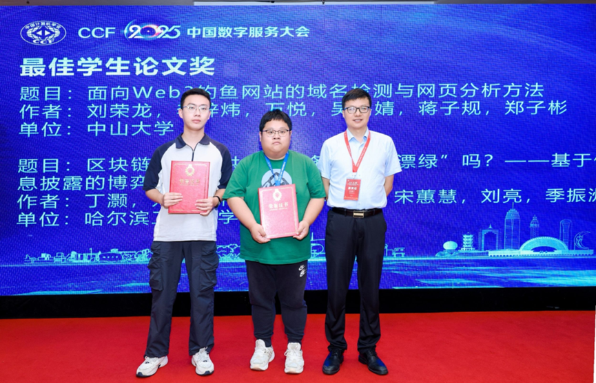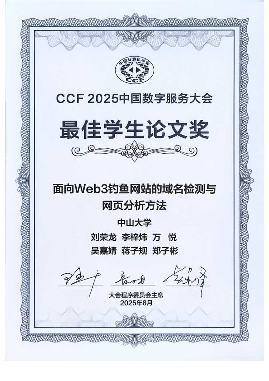 本次大会中,由学院吴嘉婧教授、蒋子规副教授、郑子彬教授指导,并由博士生李梓炜、硕士生刘荣龙、本科生万悦共同署名发表的论文《面向Web3钓鱼网站的域名检测与网页分析方法》,荣获大会“最佳学生论文奖”(仅2篇论文获此奖项)。该论文面向Web3生态中的钓鱼网站,剖析Web3钓鱼网站的“诱导-传播-攻击”三阶段流程,总结Web3钓鱼网站与传统钓鱼网站的区别。基于对钓鱼者域名设计策略的分析,论文提出了基于启发式方法的Web3钓鱼域名检测方法。进一步,论文探究了基于大语言模型的Web3钓鱼网页分析,并对Web3钓鱼网站进行了特征分析。